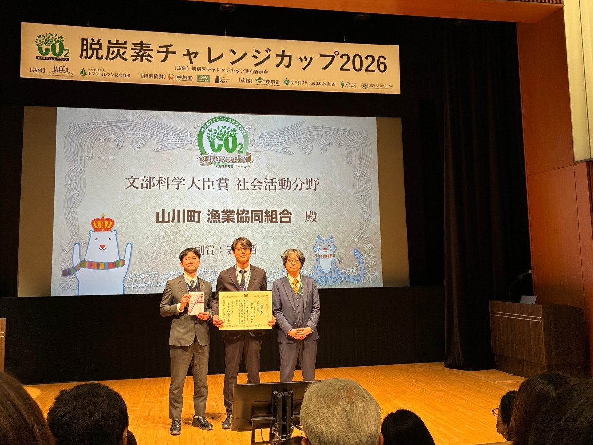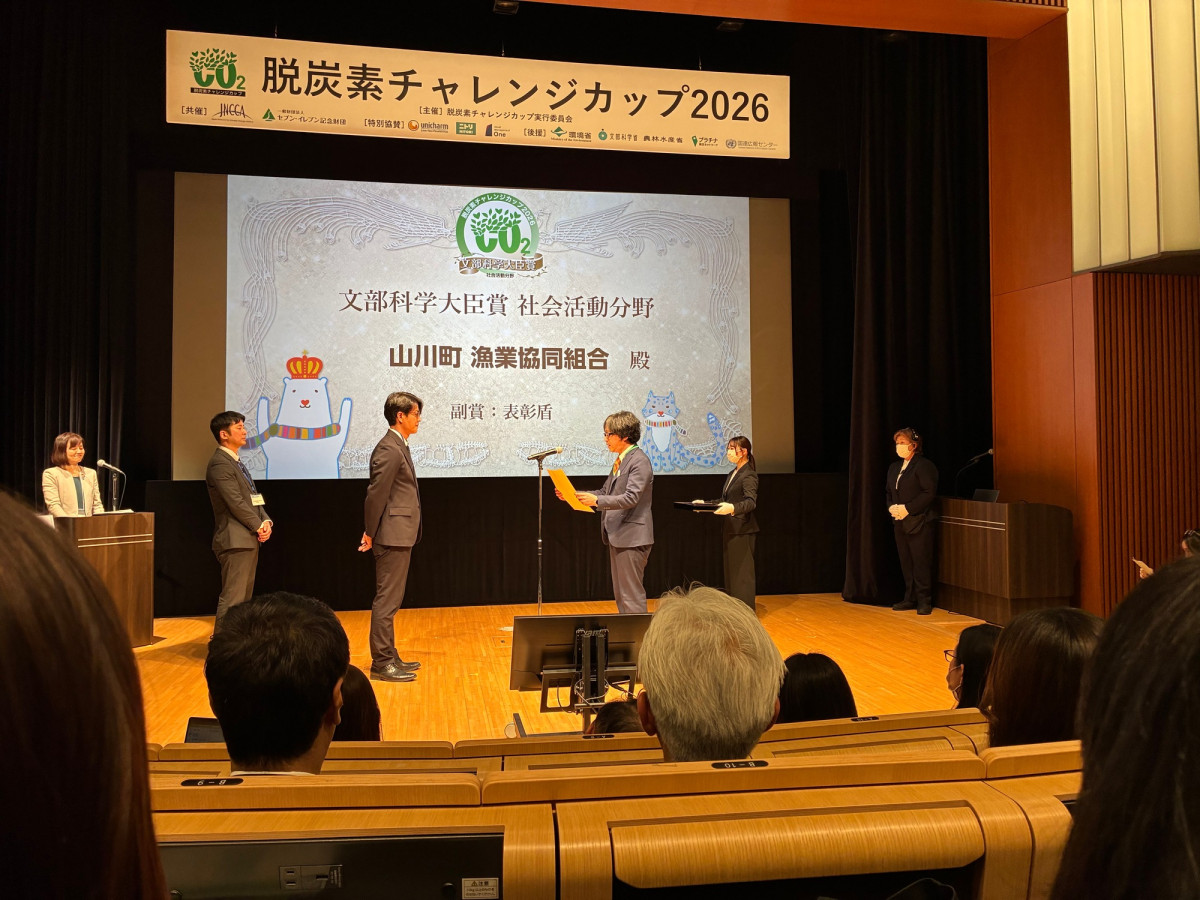 令和8年2月20日に日本科学未来館未来館ホールで開催された「脱炭素チャレンジカップ2026」にて、山川の海のゆりかごを守る会(山川町漁業協同組合)様が文部科学大臣賞(社会活動分野)を受賞されました!