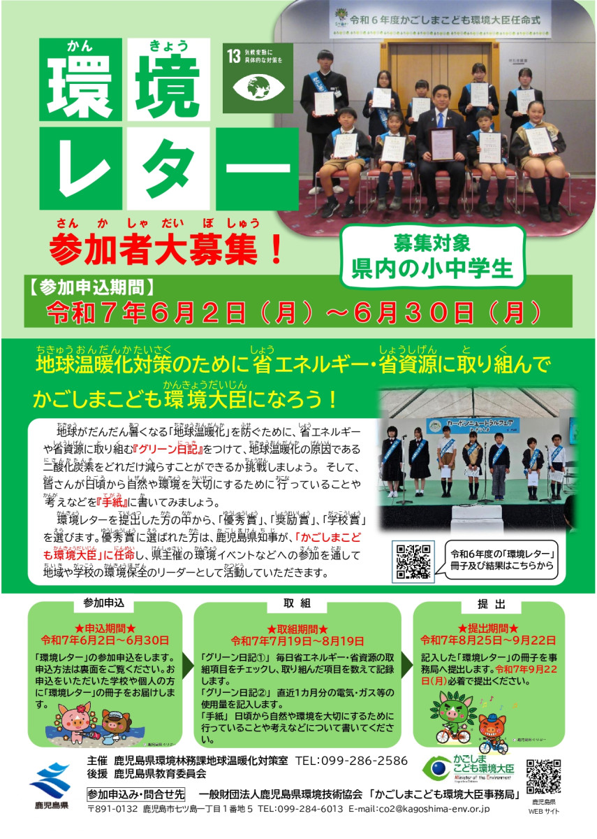 | 個人情報について | 募集で得られた個人情報は、法律に基づく命令などを除いて、令和7年度「かごしまこども環境大臣」事業以外の利用はいたしません。 |